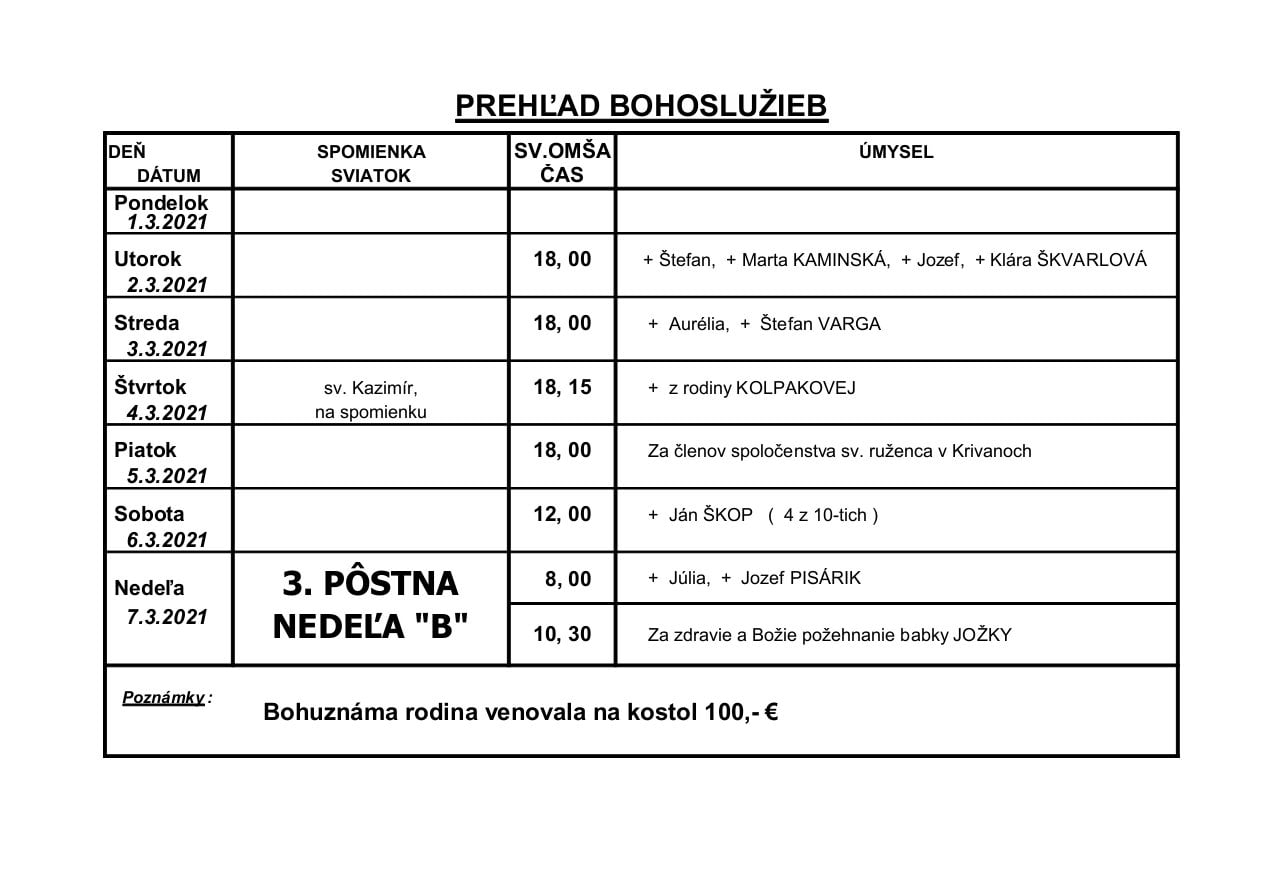 Prehľad Bohoslužieb v 9. týždni (01.03.2021 - 07.03.2021)