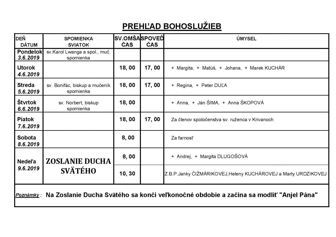 Prehľad Bohoslužieb v 23. týždni (3.6.2019 - 9.6.2019)