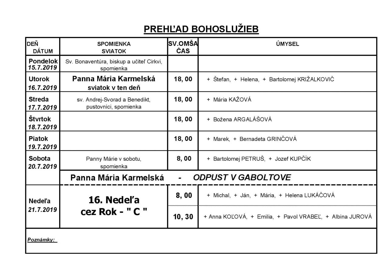 Prehľad Bohoslužieb v 29. týždni (15.7.2019 - 21.7.2019)