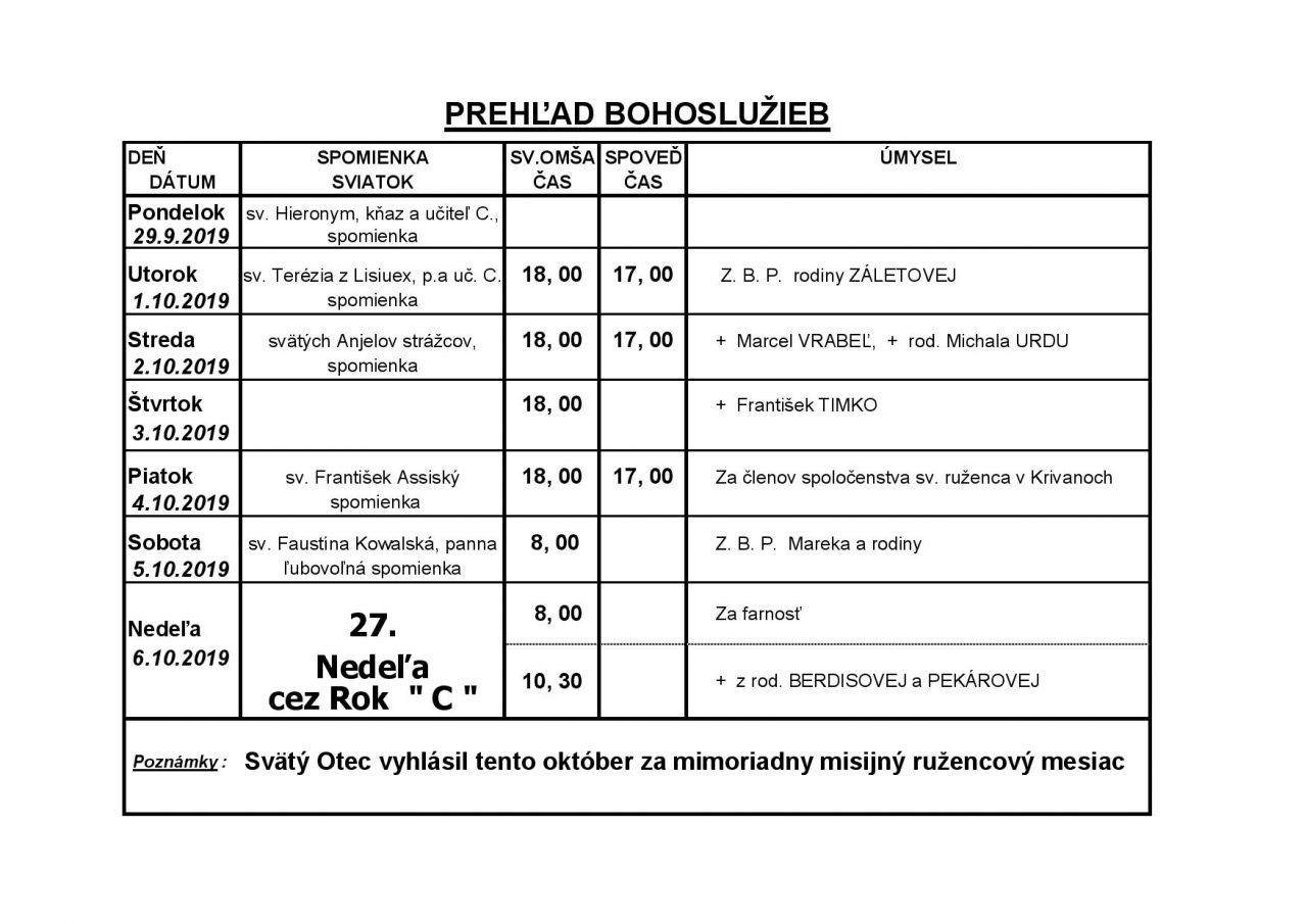 Prehľad Bohoslužieb v 40. týždni (30.9.2019 - 6.10.2019)