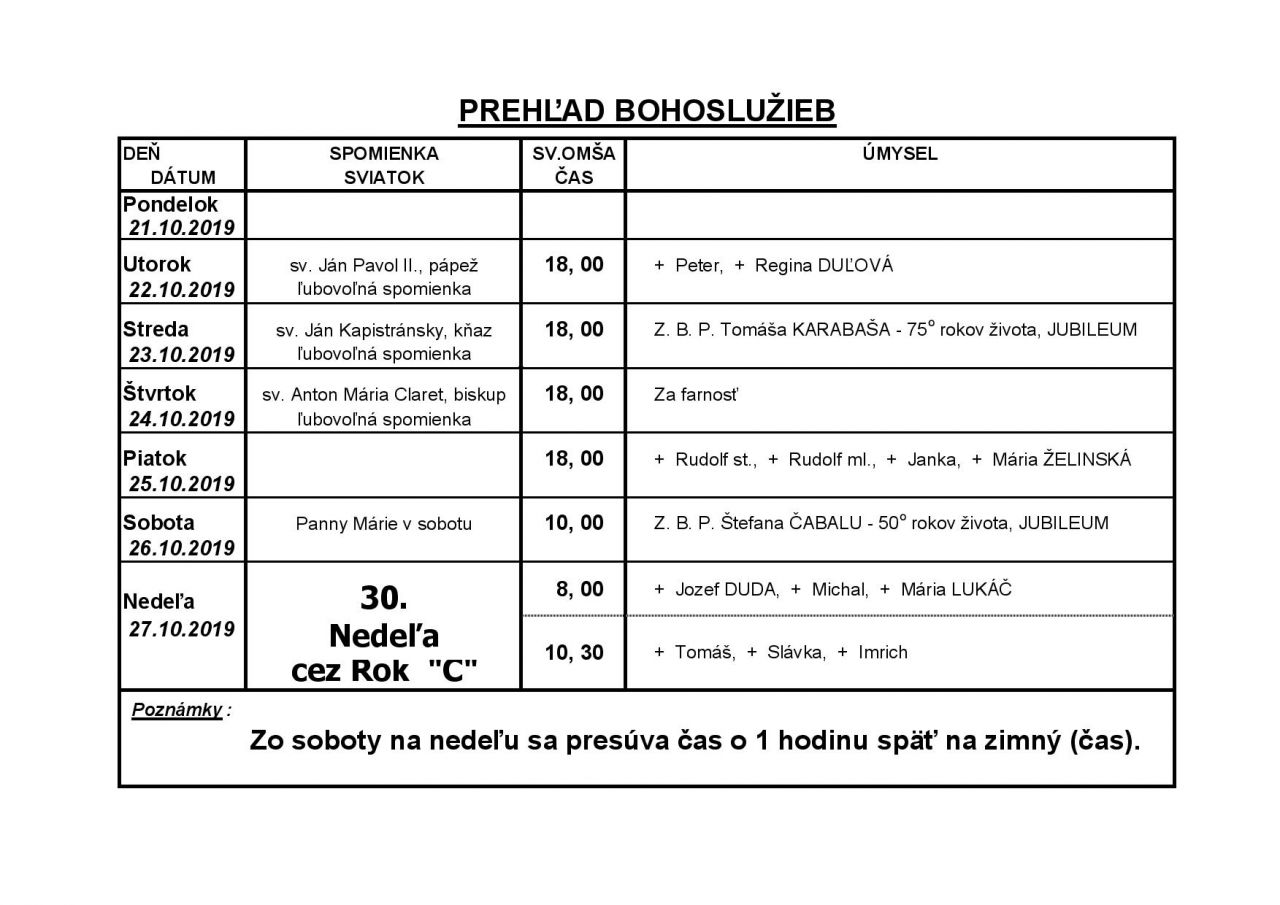 Prehľad Bohoslužieb v 43. týždni (21.10.2019 - 27.10.2019)