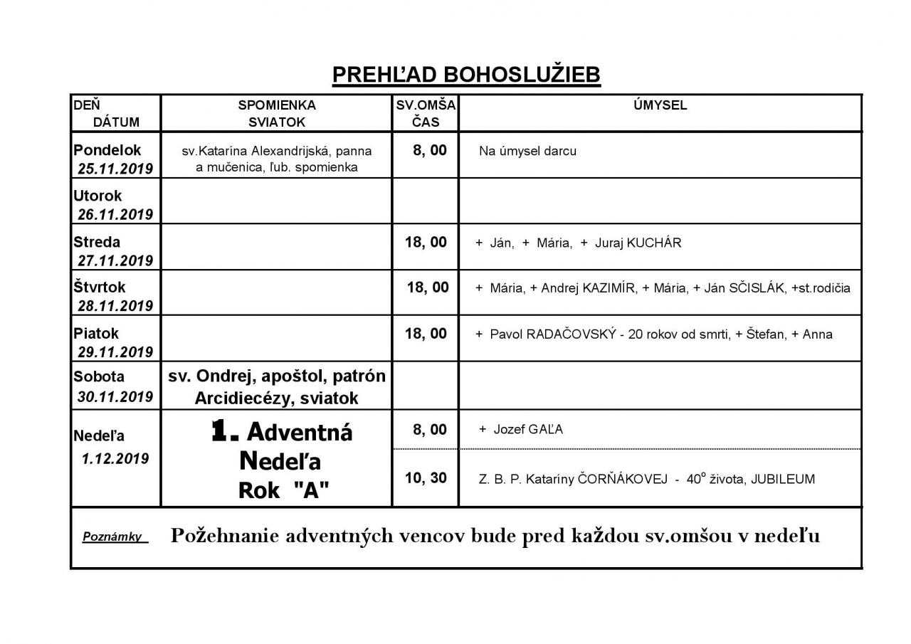 Prehľad Bohoslužieb v 48. týždni (25.11.2019 - 01.12.2019)