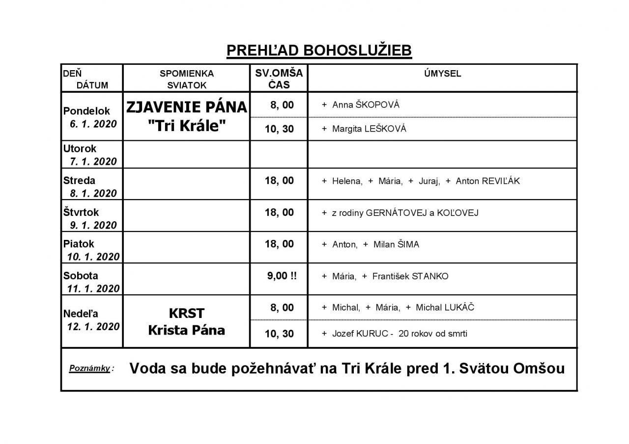 Prehľad Bohoslužieb v 2. týždni (6.1.2020 - 12.1.2020)