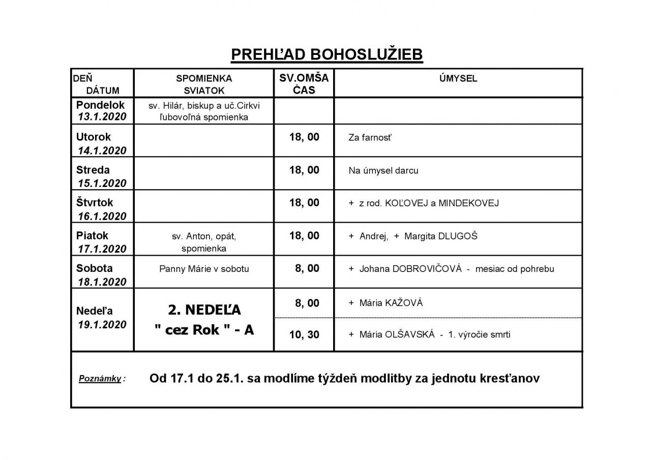 Prehľad Bohoslužieb v 3. týždni (13.1.2020 - 19.1.2020)