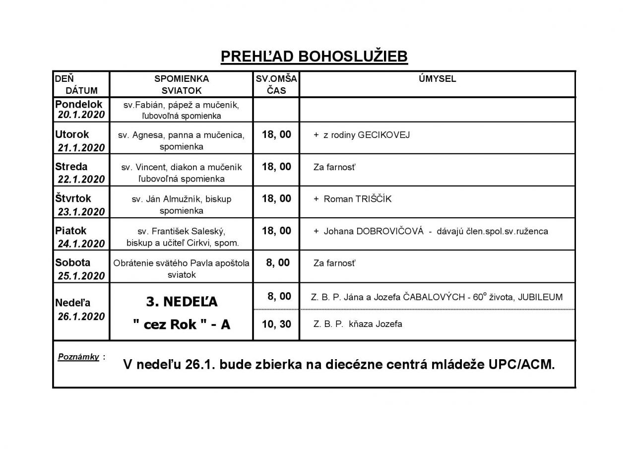 Prehľad Bohoslužieb v 4. týždni (20.1.2020 - 26.1.2020)
