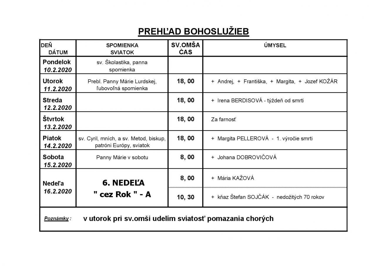 Prehľad Bohoslužieb v 7. týždni (10.2.2020 - 16.2.2020)