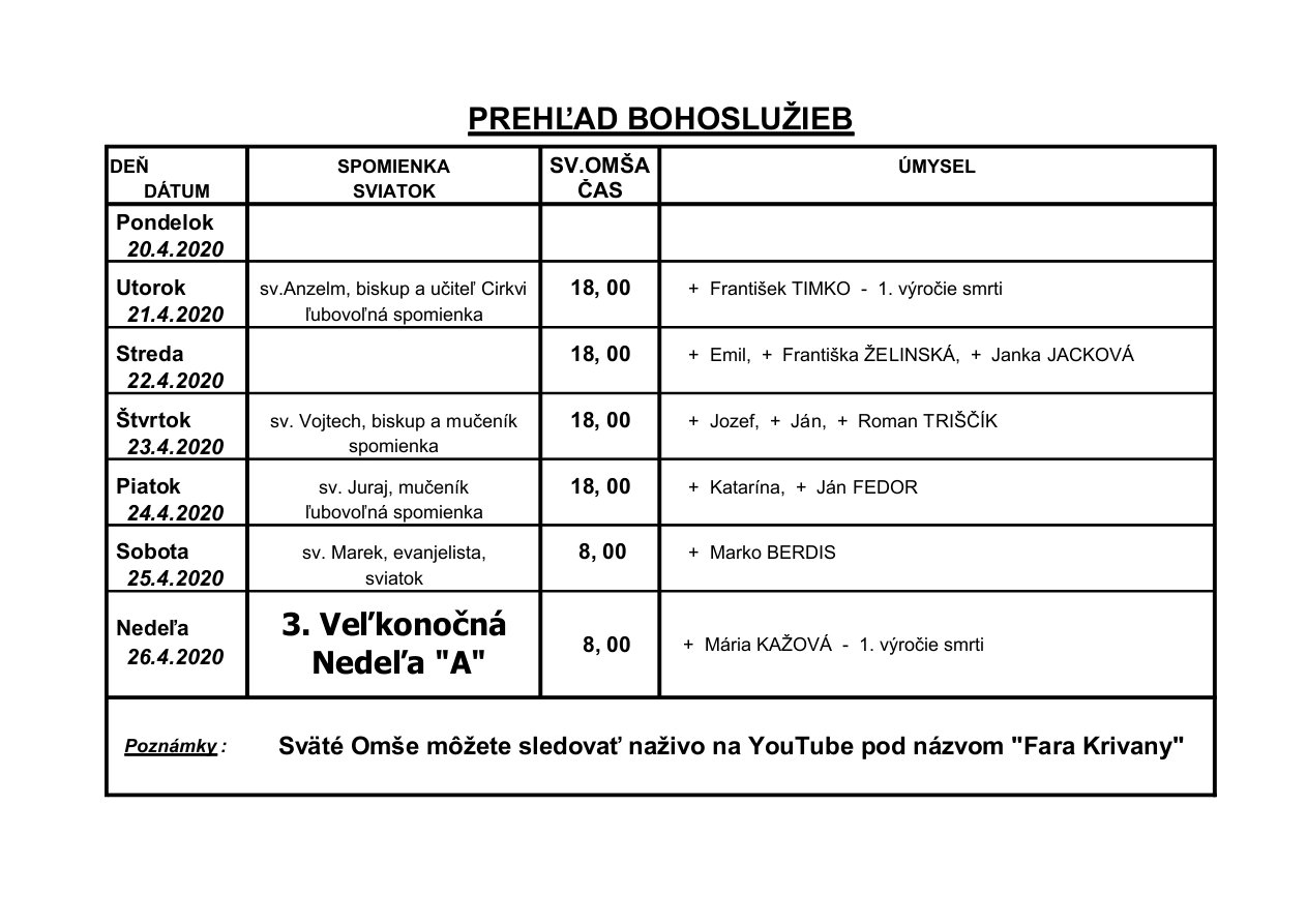 Prehľad Bohoslužieb v 17. týždni (20.4.2020 - 26.4.2020)
