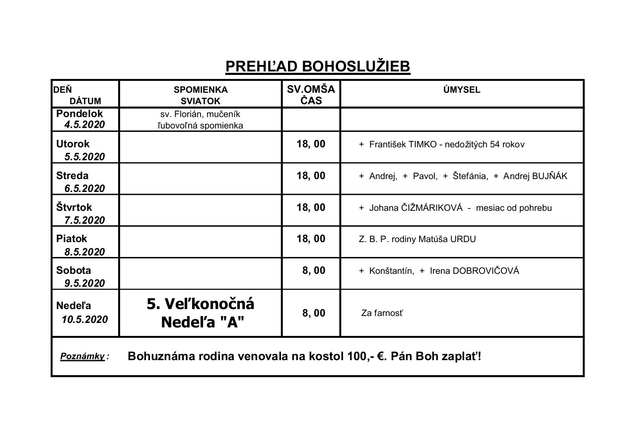 Prehľad Bohoslužieb v 19. týždni (4.5.2020 - 10.5.2020)