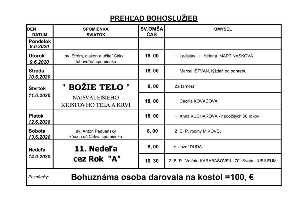 Prehľad Bohoslužieb v 24. týždni (8.6.2020 - 14.6.2020)
