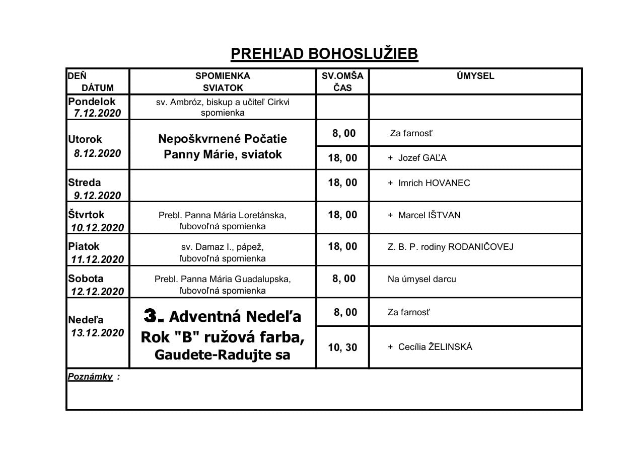 Prehľad Bohoslužieb v 50. týždni (07.12.2020 - 13.12.2020)