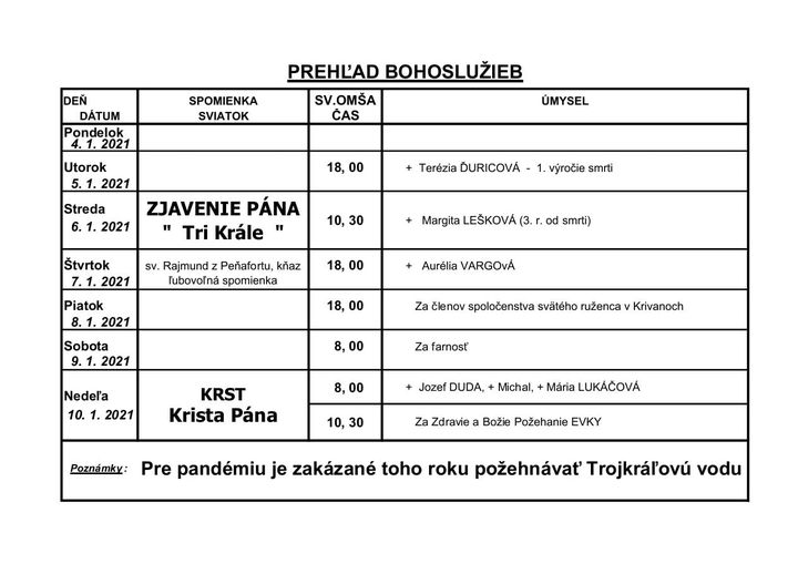 Prehľad Bohoslužieb v 1. týždni (04.01.2021 - 10.01.2021)
