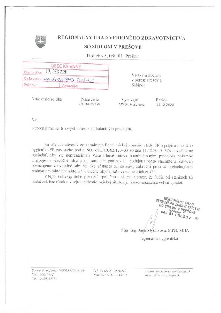 Na základe záverov zo zasadnutia Pandemickej komisie vlády SR a prípisu hlavného hygienika SR zaslaného pod č. SOPZŠČ/10362/123433.