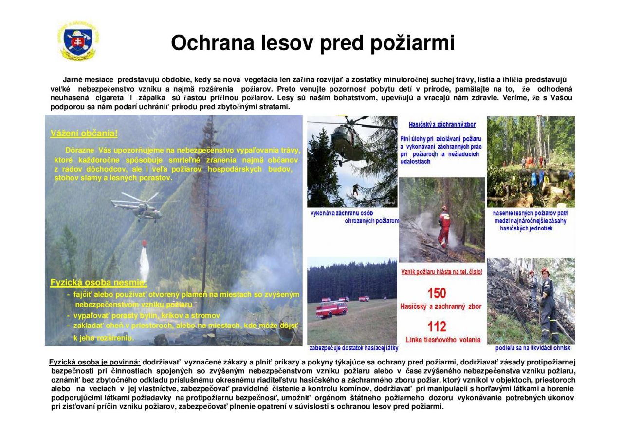 Dôrazne Vás upozorňujeme na nebezpečenstvo vypaľovania trávy, ktoré každoročne spôsobuje smrteľné zranenia najmä občanov z radov dôchodcov, ale i veľa požiarov hospodárskych budov,stohov slamy a lesných porastov.