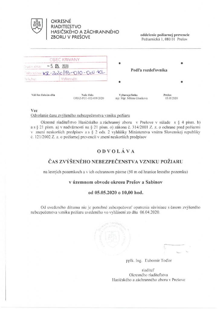Odvolanie času zvýšeného nebezpečenstva vzniku požiaru