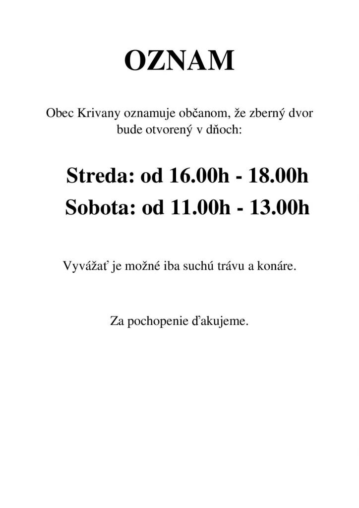 Obec Krivany oznamuje občanom, že zberný dvor bude otvorený v dňoch: streda a sobota.
