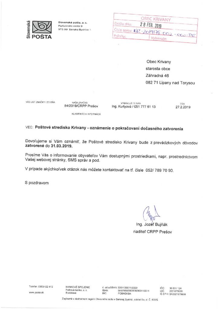 Dovoľujeme si Vám oznámiť, že Poštové stredisko Krivany bude z prevádzkových dôvodov zatvorené do 31.03.2019.