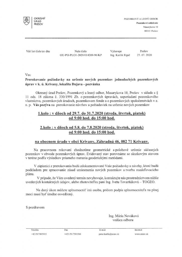 Prerokovanie požiadavky na určenie nových pozemkov JPÚ v k. ú. Krivany, lokalita Dujava.