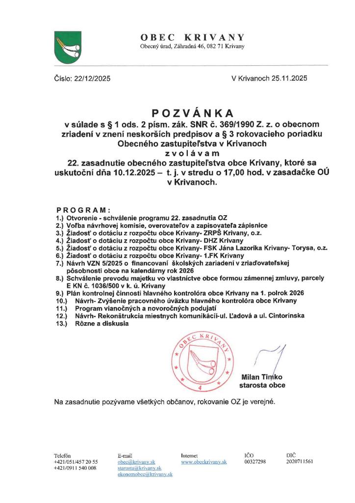 Pozvánka na 22. zasadnutie OZ