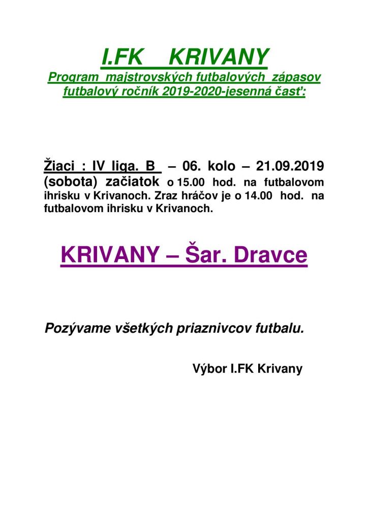 Obec Krivany pozýva všetkých futbalových fanúšikov na víkendový zápas.