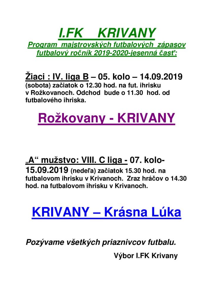 Obec Krivany pozýva všetkých futbalových fanúšikov na víkendové zápasy.