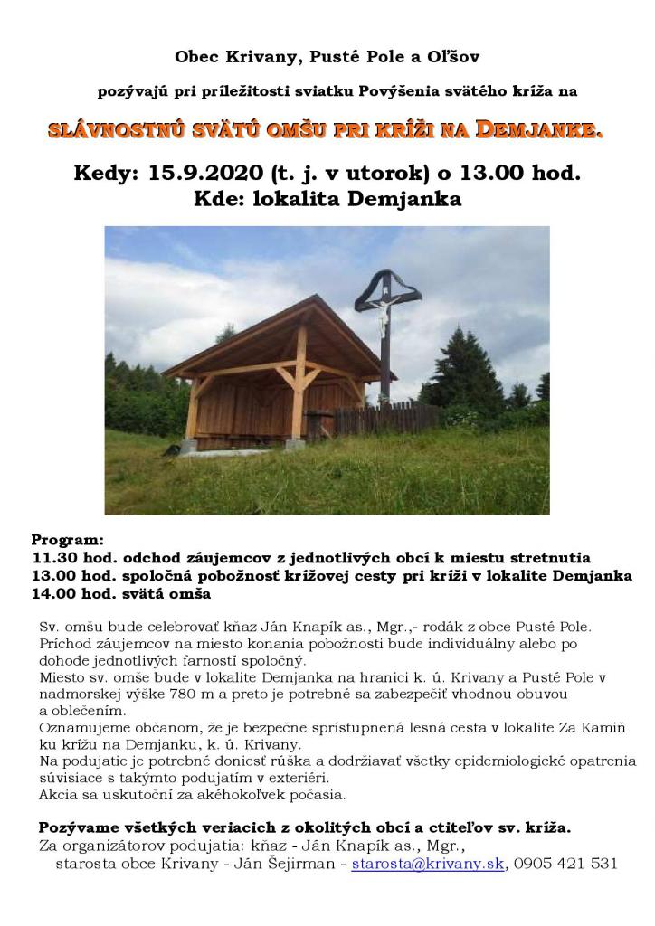 Obec Krivany, Pusté Pole a Oľšov pozývajú pri príležitosti sviatku Povýšenia svätého kríža na slávnostnú svätú omšu pri kríži na Demjanke.