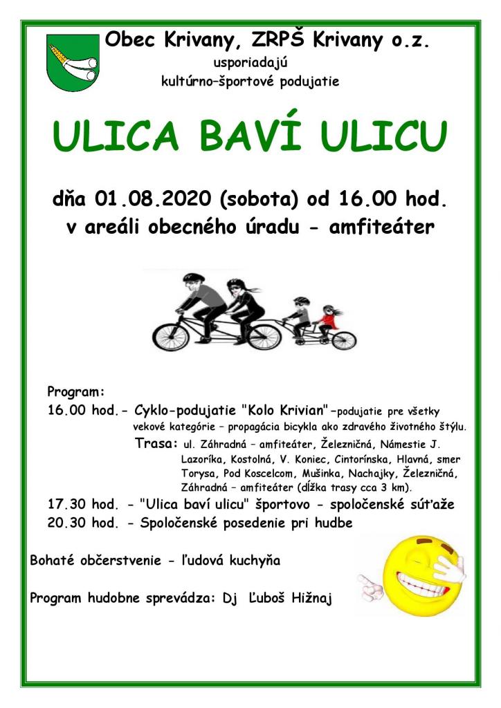 Obec Krivany, ZRPŠ Krivany o.z. Vás pozývajú na kultúrno-športové podujatie Ulica baví ulicu.