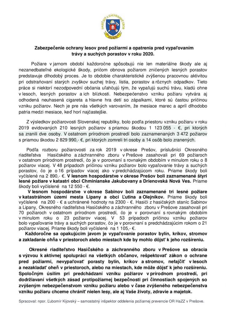 Zabezpečenie ochrany lesov pred požiarmi a opatrenia pred vypaľovaním trávy a suchých porastov v roku 2020.