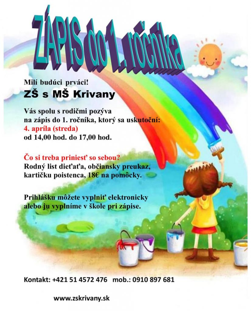 ZŠ s MŠ Krivany Vás spolu s rodičmi pozýva na zápis do 1. ročníka, ktorý sa uskutoční: 04.04.2018 (t.j. streda) od 14:00 hod. do 17:00 hod.
