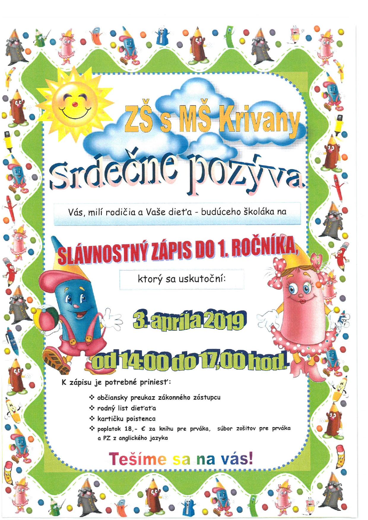 ZŠ s MŠ Krivany pozýva rodičov a deti na zápis do 1.ročníka, ktorý sa uskutoční 4. apríla 2019 od 14:00 hod. do 17:00 hod.