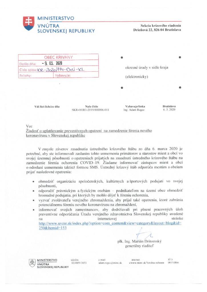 Žiadosť o uplatňovanie preventívnych opatrení na zamedzenie šírenia nového koronavírusu v Slovenskej republiky
