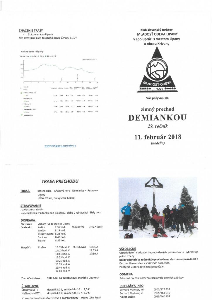 Klub slovenských turistov MLADOSŤ ODEVA LIPANY v spolupráci s mestom Lipany a obcou Krivany Vás pozývajú na 29. ročník zimného prechodu Demiankou, ktorý sa uskutoční 11. februára 2018.